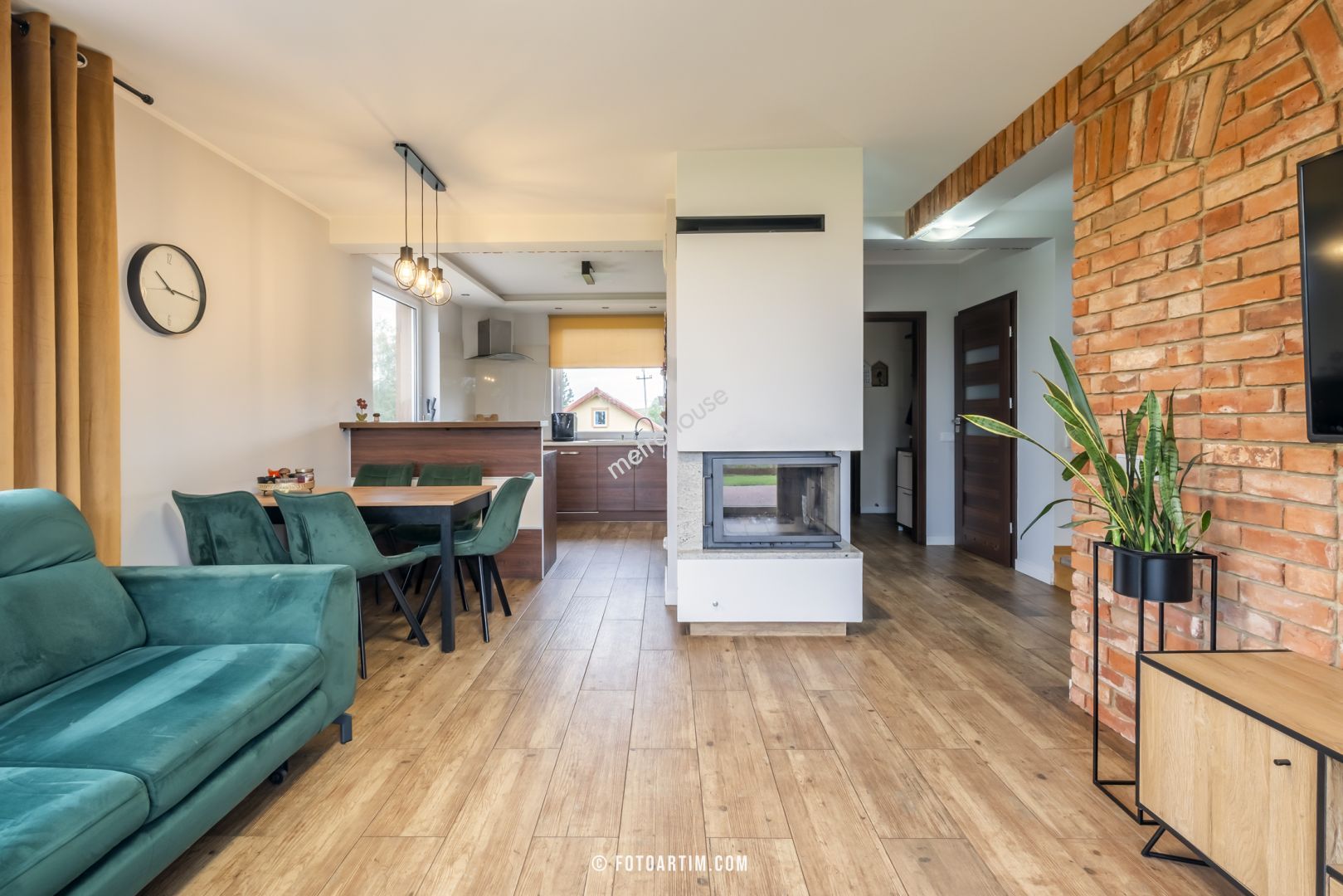 Na parterze przestronny salon z kominkiem połączony z otwartą kuchnią i jadalnią tworzy komfortową przestrzeń dzienną.