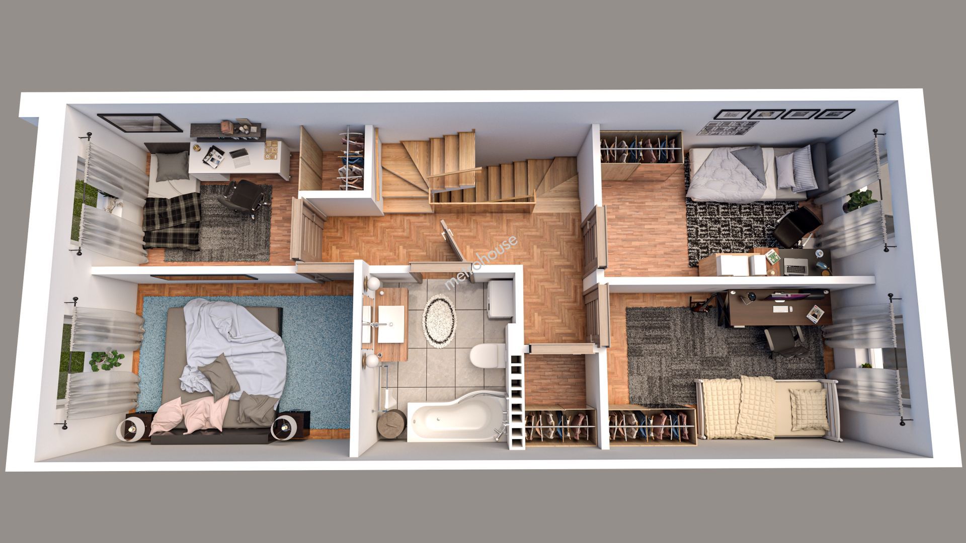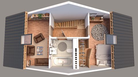 Dom składa się z trzech kondygnacji: parteru, piętra oraz poddasza użytkowego, o...