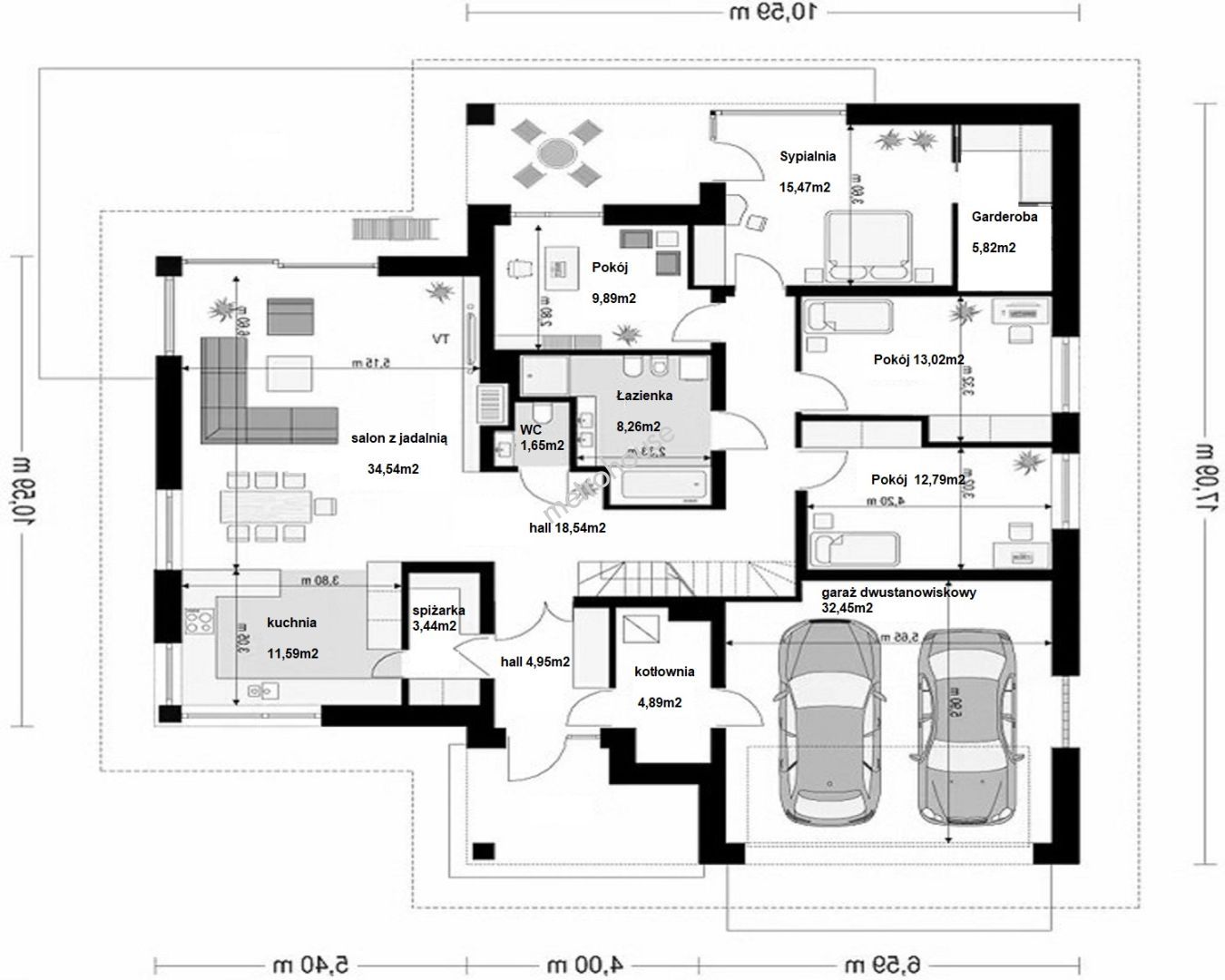 Dodatkowo w bryle budynku dwustanowiskowy garaż o wielkości 32,45m2 oraz kotłownia 4,89m2.
