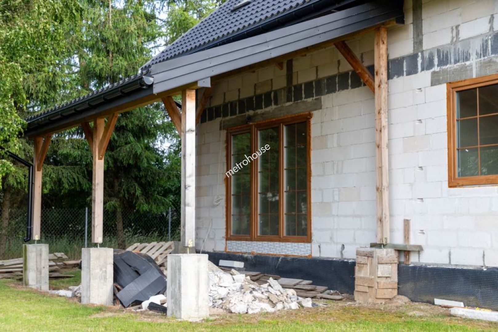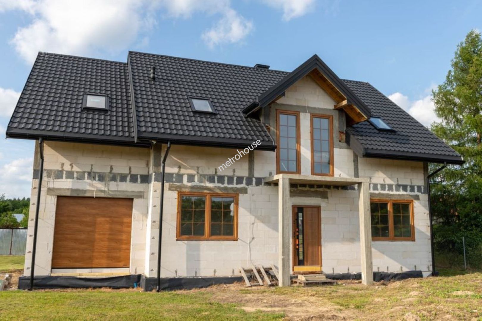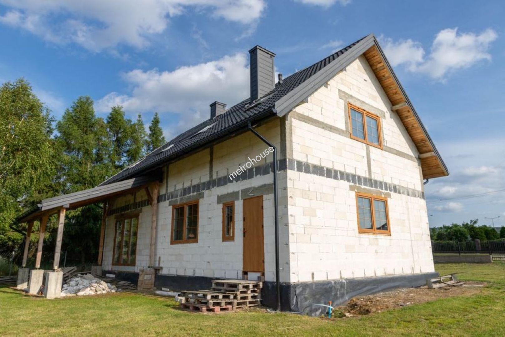 Na sprzedaż przestronny dom jednorodzinny o powierzchni 173 m², w stanie surowym z postępem prac instalacyjnych. Na parterze znajduje się salon z jadalnią, kuchnia, ,spiżarnia, pokój, łazienka, garderoba, garaż, kotłownia, wiatrołap i korytarz. Na piętrze trzy sypialnie, korytarz, łazienka i strych.