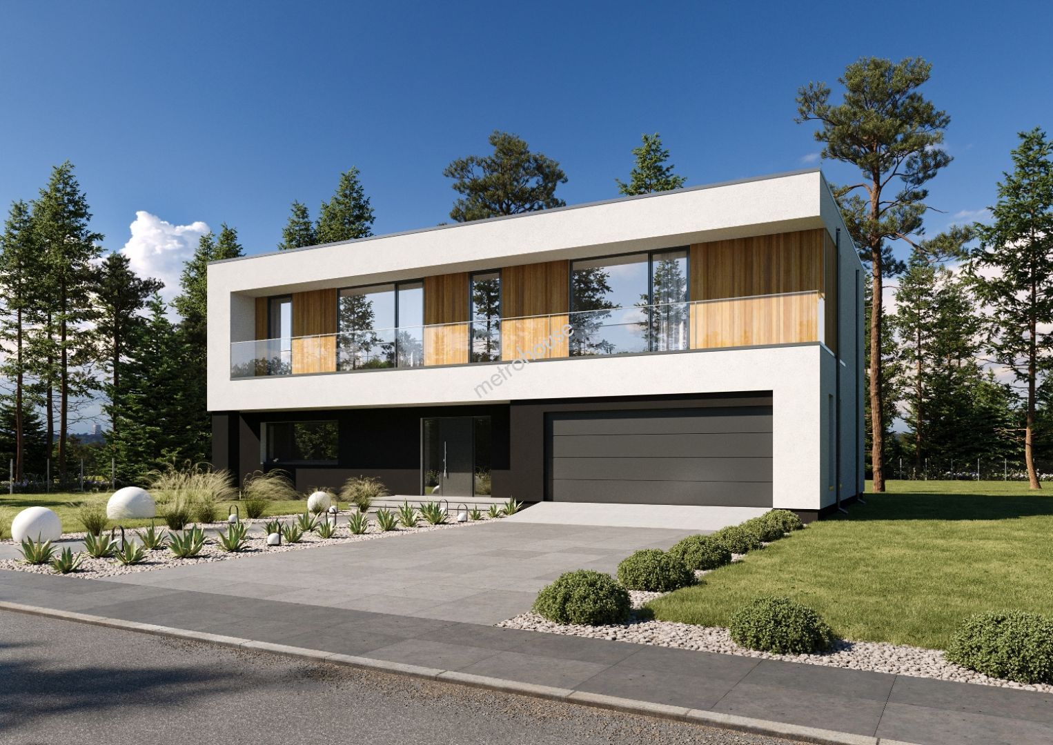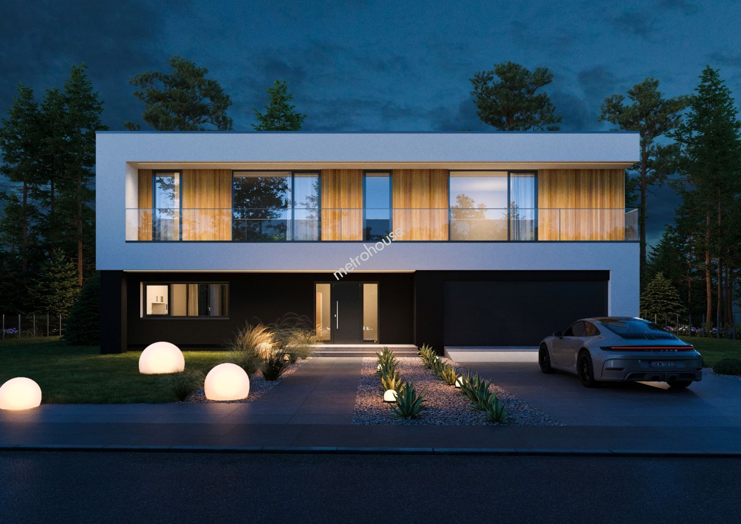 Autorski projekt willi z płaskim dachem został stworzony z myślą o maksymalnej funkcjonalności i estetyce. Elewację budynku podkreśla subtelne oświetlenie LED, a z piętra rozpościera się widok z szerokiego balkonu ze szklaną balustradą.