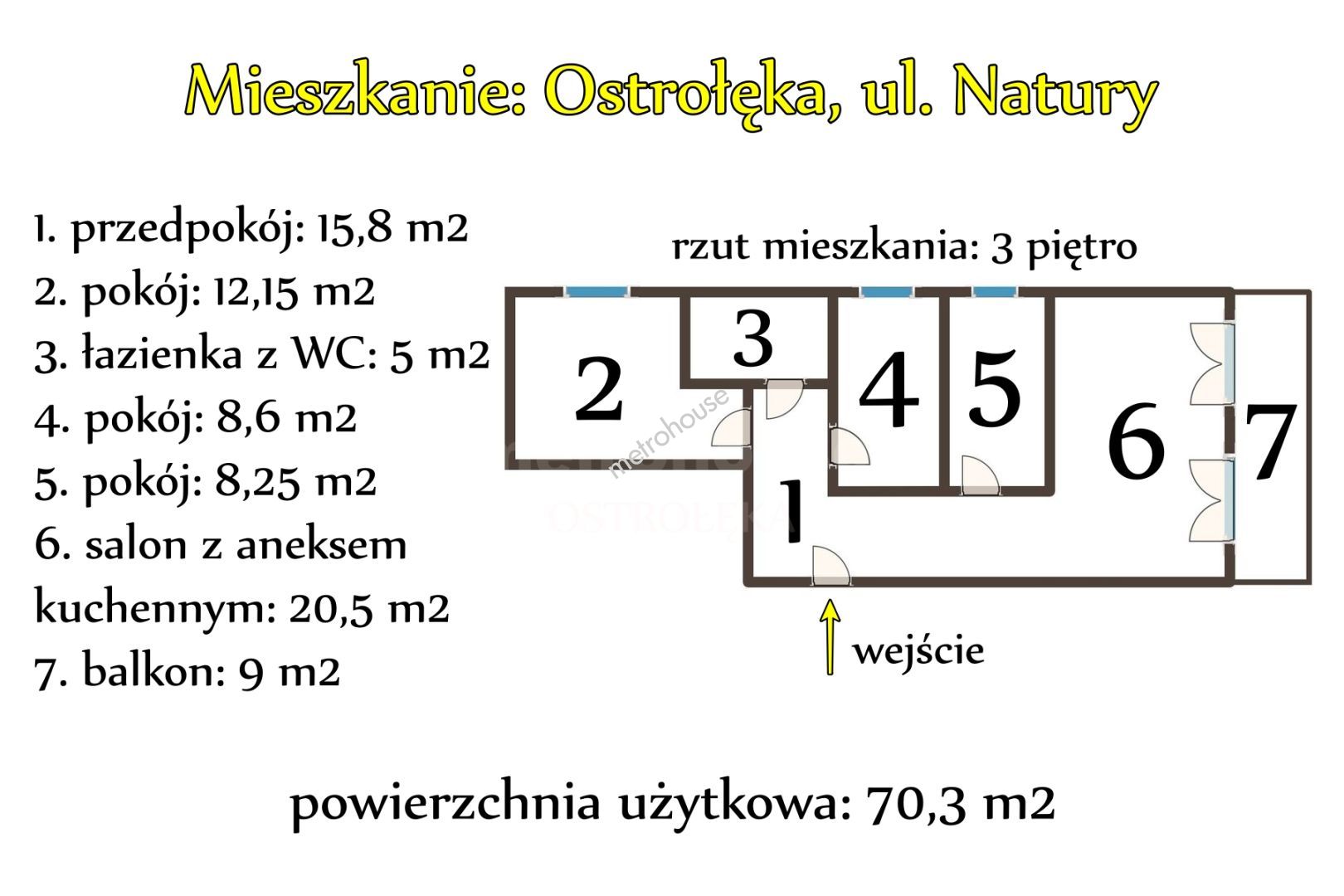 Lokal mieszkalny zlokalizowany na osiedlu przy ulicy Natury w Ostrołęce. Mieszkanie o powierzchni 70,3 m2 składa się z salonu z aneksem kuchennym, trzech pokoi, łazienki z WC i przedpokoju. Do nieruchomości przynależy duży balkon o pow. 9 m2.