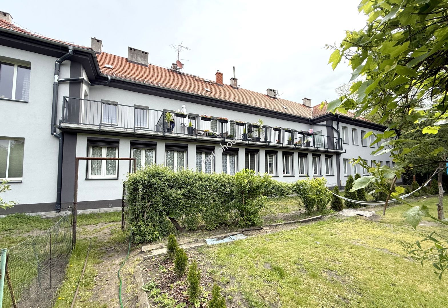 Wokół budynku zieleń, a za budynkiem ogródki.