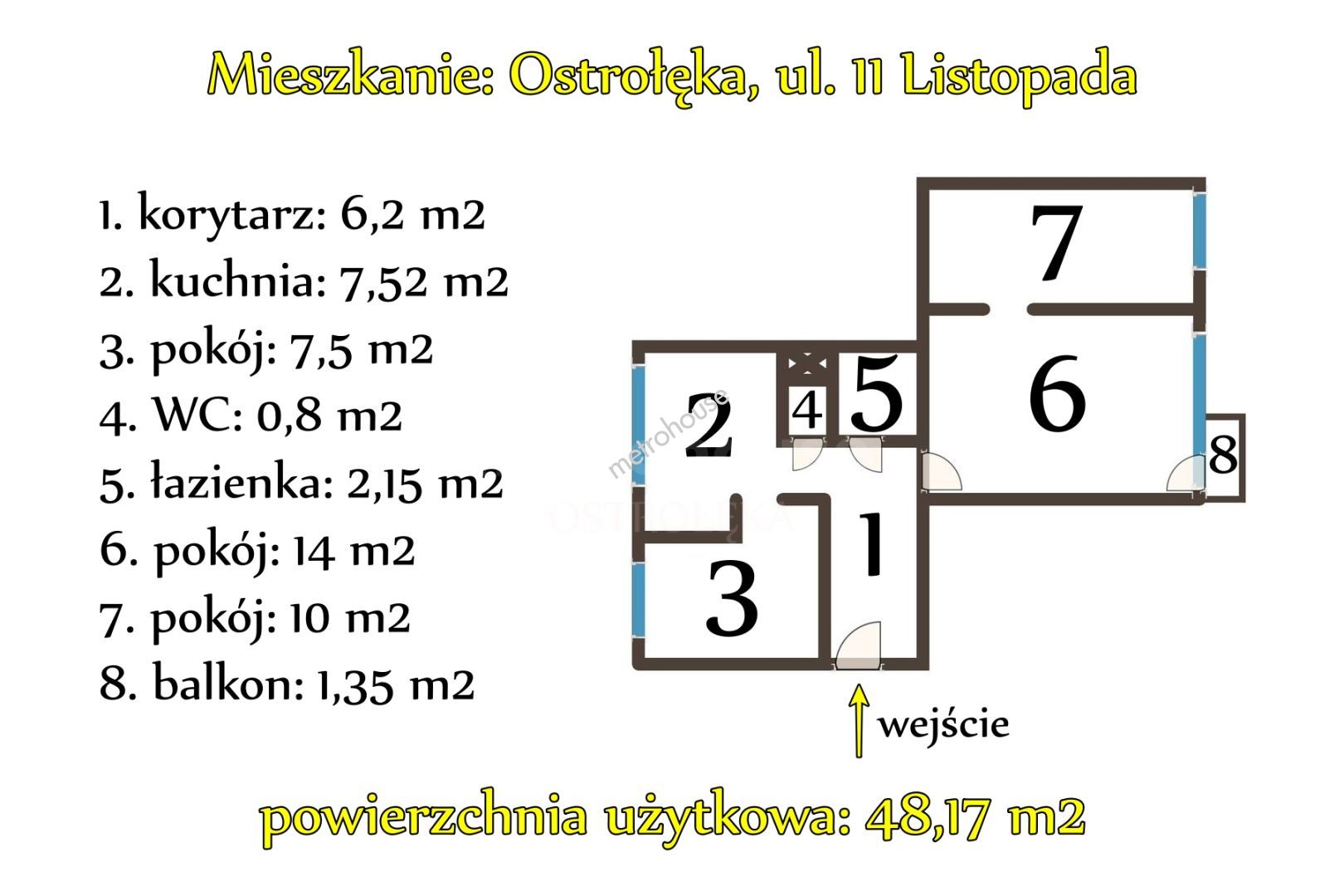 Układ pomieszczeń: trzy ustawne pokoje, kuchnia, korytarz, łazienka, osobne WC oraz balkon o pow. 1,35 m2. Do lokalu mieszkalnego przynależy również piwnica.