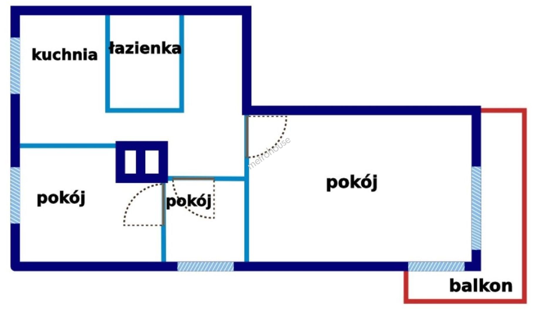 Składa się z trzech pokoi, oddzielnej kuchni, łazienki i przedpokoju.
