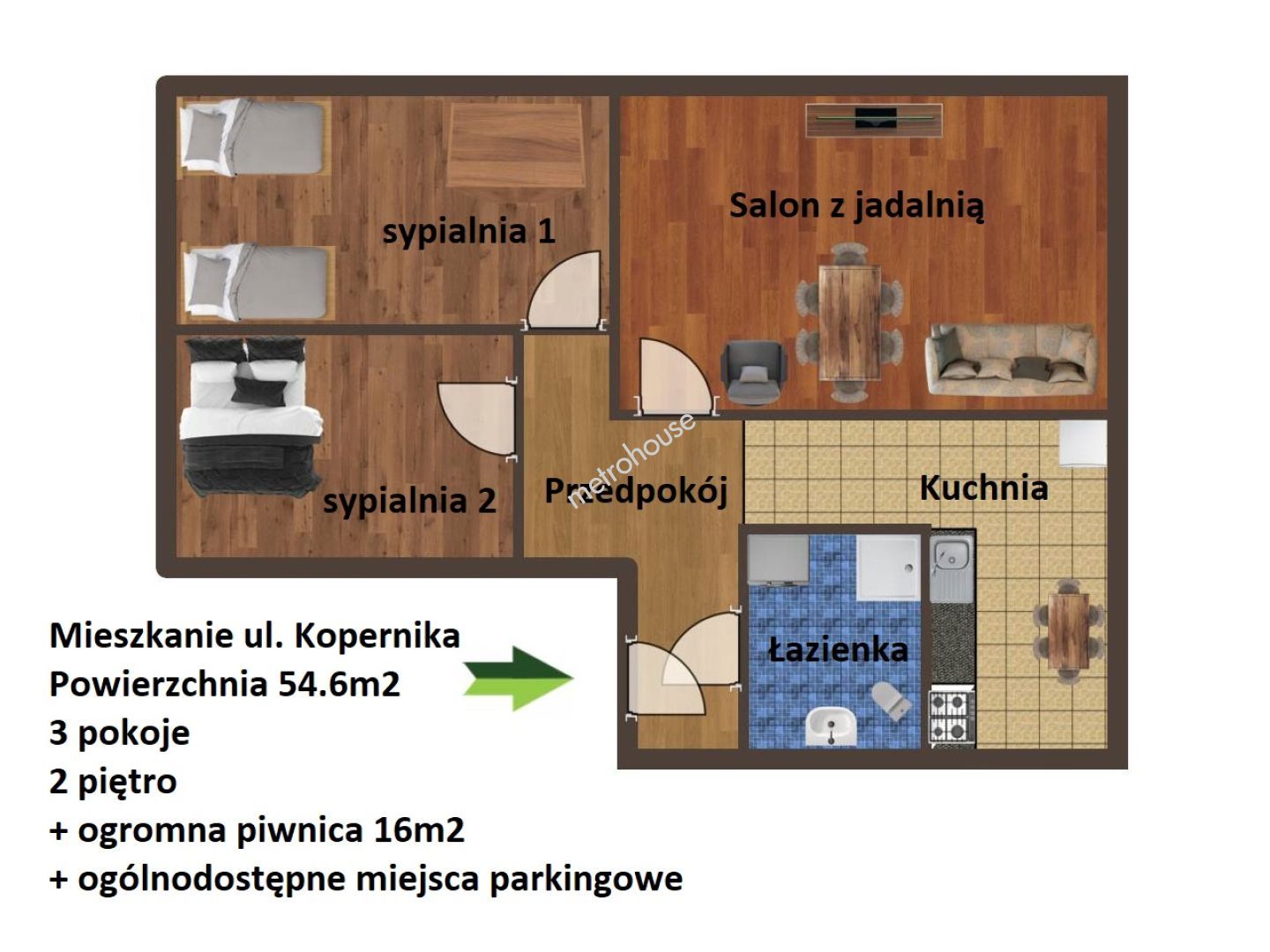 Nieruchomość o powierzchni 54.6m2 znajduje się na 2 piętrze, a w jej skład wchodzą: