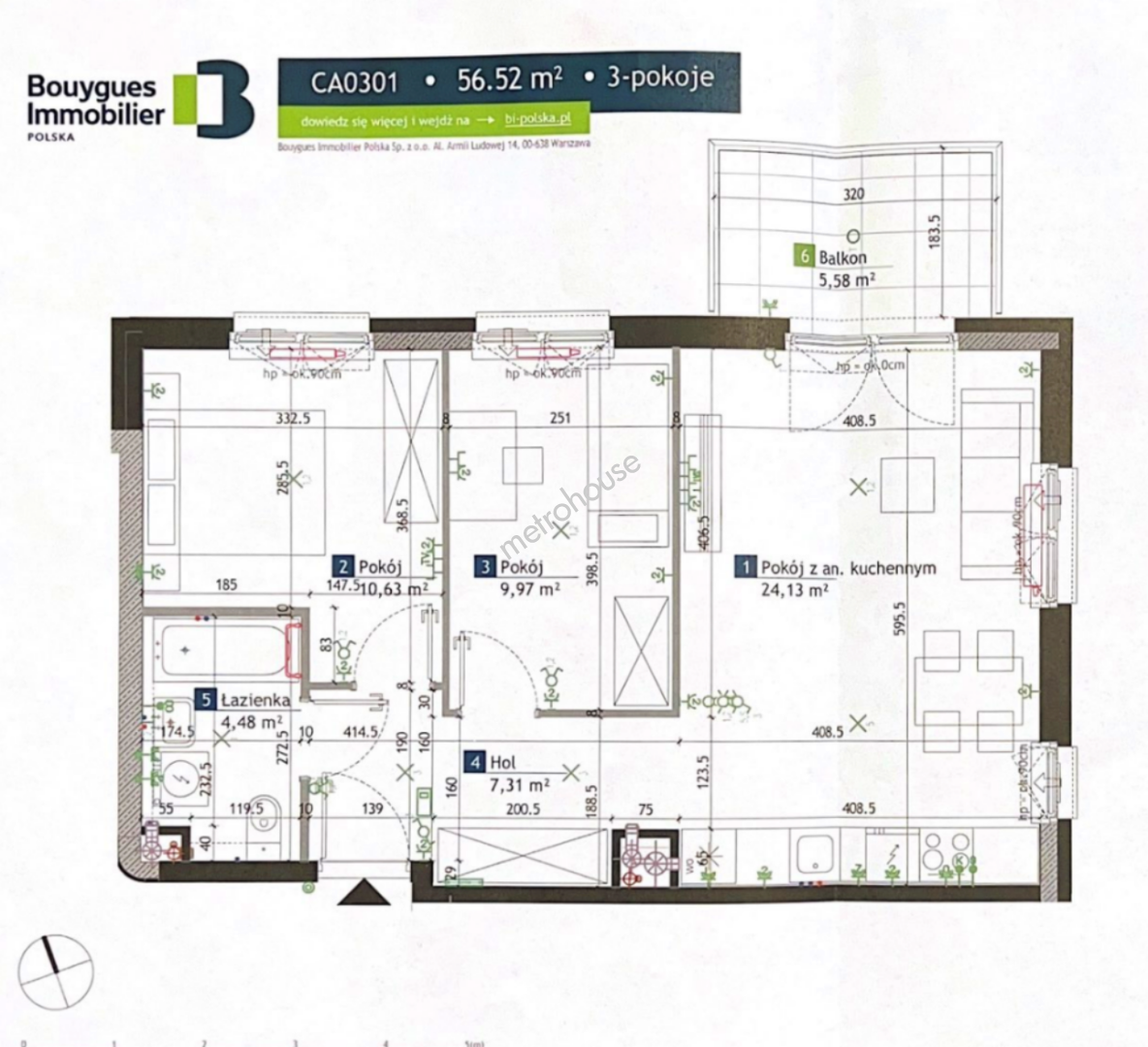 Pokoju z aneksem kuchennym - 24,23 m² Pokoju - 10,63 m² Pokoju - 9,97 m² Holu - 7,31 m² Łazienki - 4,48 m² Balkonu - 5,58 m² Ustawny...